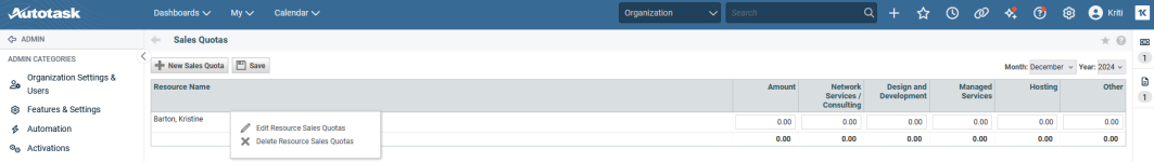 In Autotask können Sie Verkaufsquoten für alle Vertriebsmitarbeiter in Ihrer Firma einrichten. Die tatsächliche Verkaufsleistung kann monatlich, vierteljährlich oder jährlich an der Quote für jede Vertriebsressource, jedes Gebiet oder jede Region gemessen werden.