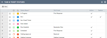 NAVIGATION Linkes Navigationsmenü > Verwaltung > Verwaltungskategorien > Funktionen und Einstellungen > Service Desk (Tickets) > Aufgaben- und Ticketstatus