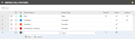 | Standard | Der als Standard ausgewiesener Status wird angewandt, wenn neue Servicetermine erstellt werden. Der Systemstatus Neu ist zunächst der Standardstatus, jedoch können Sie einen beliebigen anderen Status als Standard einrichten. |
