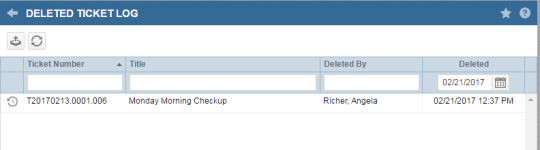 - Geben Sie alles oder einen Teil der Ticketnummer, des Titels oder des Namen des Mitarbeiters, der das Ticket gelöscht hat, im Suchfeld oben in der entsprechenden Spalte ein.