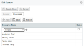 Alle Mitarbeiter, die der Queue bereits zugewiesen sind, werden auf der Registerkarte „Mitarbeiter“ aufgelistet. So fügen Sie eine Ressource zur Warteschlange hinzu: |
