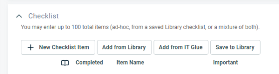 WICHTIG Nach dem Hinzufügen zum Ticket können Sie die Checkliste wie jede andere Autotask-Checkliste verwalten. Für Artikel, die aus IT-Kleber-Checklistenvorlagen stammen, werden keine Einschränkungen festgelegt. Es wird nicht mit IT Glue verknüpft.