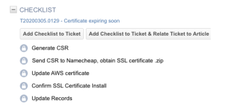 Knowledge Base-Artikel und -Dokumente können Checklistenvorlagen enthalten, die in ein Ticket kopiert werden können. Wenn Sie den Beitrag oder das Dokument über ein Ticket öffnen, können Sie die Checkliste in das Ticket kopieren.