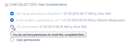 - Benutzer ohne diese Berechtigung können lediglich von ihnen abgeschlossene Checklisteneinträge zurück auf nicht abgeschlossen setzen. Im nachfolgenden Screenshot sieht man, dass Nathalie lediglich Einträge auf nicht abgeschlossen setzen kann, die sie selbst zuvor abgeschlossen hat. Von Alice abgeschlossene Einträge weisen eine ausgegraute Schaltfläche mit einem Schloss auf, wenn mit der Maus darübergefahren wird.
