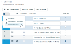 Entfernt den Eintrag aus der Checkliste. HINWEIS Um die gesamte Checkliste aus dem Ticket zu löschen, verwenden Sie das Bulk-Menü. Siehe Checklistenelemente aus einem Ticket, einer Aufgabe oder einer Opportunity löschen. |