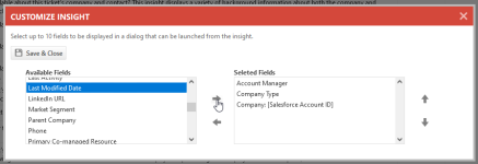 Das Dialogfeld „Insight anpassen“ wird angezeigt. Eckige Klammern um einen Feldnamen zeigen an, dass das Feld ein benutzerdefiniertes Feld ist. - Mithilfe der Pfeile links und rechts verschieben Sie die Liste der verfügbaren Felder in die Liste der ausgewählten Felder. Sie können bis zu 10 Felder auswählen. Geschützte und vertrauliche Felder können nicht ausgewählt werden.