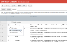 NAVIGATION Linkes Navigationsmenü > Verwaltung > Verwaltungskategorien > Funktionen und Einstellungen > Service Desk (Tickets) > Ticket-Kategorien > Kontextmenü für ausgewählte Kategorie > Bearbeiten > Registerkarte Einblicke
