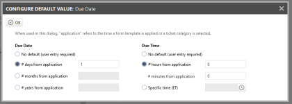 | Keine Vorgabe (Benutzereintrag erforderlich) | Wählen Sie dies, wenn das Feld kein standardmäßiges Fälligkeitsdatum haben soll. Benutzer müssen das Datum beim Erstellen des Tickets angeben. |