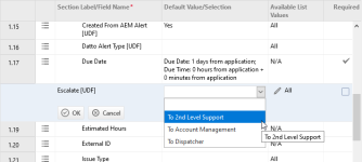 TIPP Wenn Ihre eigene Firma eine RMM-Integration (Remote Monitoring & Management) verwendet, sehen Sie möglicherweise benutzerdefinierte Systemfelder, bei denen der Name der Name der Integration gefolgt von der ID ist. In der Spalte Standardwert wird kein Wert angezeigt. Jedoch wird bei RMM-ID-Feldern der Wert automatisch von der Integration generiert, wenn das Ticket generiert wird. Sie können den Standardwert weder hinzufügen noch bearbeiten.