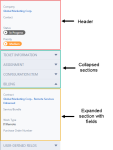 Der Detailbereich befindet sich immer links neben dem Hauptbereich. Er besteht aus einem vorgegebenen Kopfbereich, die immer angezeigt wird, sowie einer unterschiedlichen Anzahl von zusätzlichen Abschnitten, die erweitert und reduziert werden können. Diese enthalten die Objektfelder, die von der Rubrik angezeigt werden (einschließlich benutzerdefinierter Felder).
