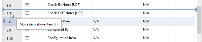 - Wählen Sie eine Feldzeile in der Spalte Reihenfolge aus und ziehen Sie sie an eine andere Stelle im gewünschten Abschnitt. Eine blaue Linie zeigt die neue Position des Felds an.