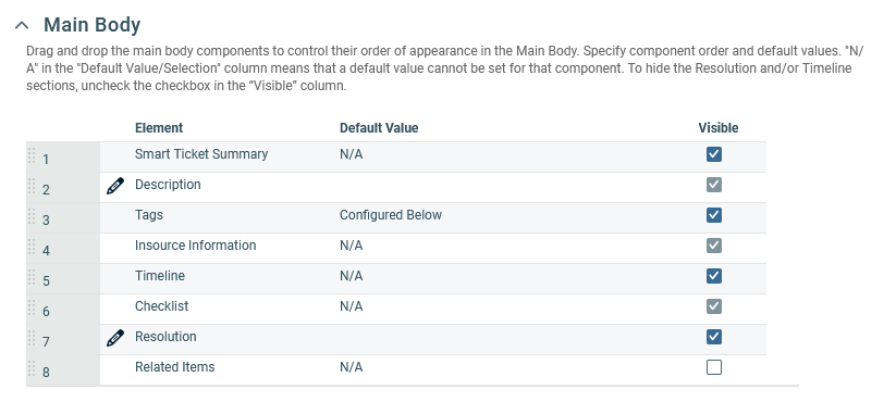 Die Lösungskomponente kann ausgeblendet werden. Das Kontrollkästchen Sichtbar kann bearbeitet werden. Sie müssen nicht auf das Bleistiftsymbol klicken. Wenn das Kontrollkästchen ausgewählt ist, erscheint das Feld Lösung auf dem Ticket. Klicken Sie auf das Kontrollkästchen, um die Markierung aufzuheben oder es zu markieren. |