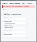 - Geben Sie bis zu fünf Alternative E-Mail-Adressen für Absender ein. Alle E-Mail-Adressen, die Sie hier eingeben, müssen mit einer verifizierten Domain verbunden sein. Siehe Domain-Einstellungen verwalten.