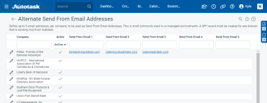 Die Seite Alternative Absender-E-Mail-Adressen ist eine Suchtabelle, die alle Organisationen in Ihrer Autotask-Instanz auflistet. Um die Seite zu öffnen, nutzen Sie den/die Pfad(e) im vorstehenden Abschnitt Sicherheit und Navigation.