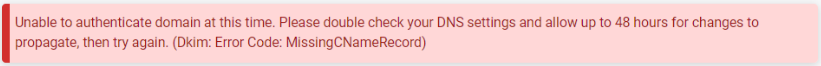 - Wenn die Authentifizierung fehlschlägt, wird in einer Fehlermeldung ein Grund dafür angegeben. Die Authentifizierung kann fehlschlagen, weil Sie nicht genug Zeit eingeplant haben oder weil Sie das Limit von 5 Domains erreicht haben. Es ist auch möglich, dass die Validierung erfolgreich ist, aber die DKIM-Authentifizierung fehlschlägt. Die Fehlermeldung zeigt an, ob es sich um eine Validierung oder eine DKIM-Fehlermeldung handelt.