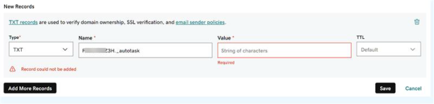 Die Zeichenfolge für die Domain-Validierung ist pro Domain und pro Autotask-Instanz einmalig. Die Validierungs-ID muss der TXT-Name sein (Beispiel: EEVRMQAP4L._autotask.yourdomain.com ). Abhängig von Ihrem DNS-Anbieter kann das Feld Wert erforderlich sein. Sie können einen beliebigen Wert (einen Punkt oder ein Leerzeichen) übergeben, sofern das Feld Name korrekt ausgefüllt ist. Autotask überprüft nur den TXT-Namen dieses Datensatzes. Wenn Sie eine Domäne für mehrere Datenbanken oder andere MSPs freigeben, empfehlen wir Ihnen, einen Namen für die andere Datenbank in das Feld Wert dieses TXT-Datensatzes einzugeben. Auf diese Weise wird bei der Überprüfung Ihrer DNS-Einträge klar, welche ID zu welcher Datenbank gehört. |