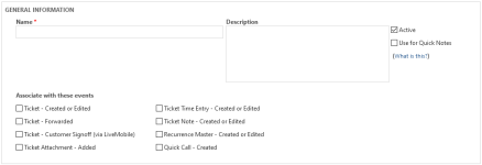 | Für Kurznotizen verwenden | Wenn diese Vorlage die Standardvorlage für alle Kurznotizen sein soll, wählen Sie das Kontrollkästchen aus. Siehe Eine Vorlage für Benachrichtigungsmails für Kurznotizen und Quick-Zeiteinträge auswählen. | |||||||||||||||||||||||||||||||||||||||||||||||||