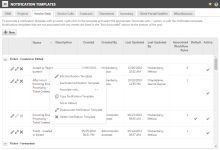 Vorlagen für Benachrichtigungsmails werden auf der Seite Vorlagen für Benachrichtigungsmails erstellt und verwaltet. Jede Registerkarte steht für einen Bereich in Autotask. Auf jeder Registerkarte werden die Vorlagen nach den Ereignissen gruppiert, die Benachrichtigungsmails auslösen können. Um die Seite zu öffnen, nutzen Sie den/die Pfad(e) im vorstehenden Abschnitt Sicherheit und Navigation.