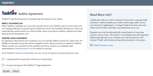 Lesen Sie die Vereinbarung durch, wählen Sie beide Kontrollkästchen aus und klicken Sie auf Akzeptieren. Das Dialogfenster wird geschlossen und der Taskfire-Abschnitt wird aktualisiert.
