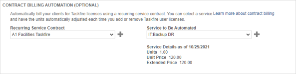 Autotask Ihnen eine monatliche Gebühr für jede individuelle Taskfire-Lizenz in Rechnung, die Sie einem Ihrer Kunden zur Verfügung stellen. Damit Sie die Kosten für Taskfire-Lizenzen ganz einfach an Ihre Kunden weitergeben können, erscheint der Abschnitt Vertragsabrechnungsautomatisierung (optional) auf der Seite „Kundenportal - Kundendetails“, nachdem Sie Taskfire für einen Kunden aktiviert haben. Hier können Sie den Servicevertrag und den Service erstellen oder auswählen, den Sie für die Abrechnung von Taskfire-Lizenz verwenden möchten. Bei der automatisierten Abrechnung wird die Lizenzgebühr jedes Mal automatisch anteilig berechnet und dem Service hinzugefügt, wenn Sie einen Taskfire-Benutzer aktivieren.