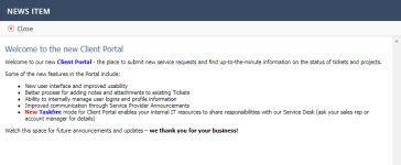 News-Items sind Ankündigungen, die für alle Kunden auf allen Seiten des Portals erscheinen. Dies ist eine großartige Möglichkeit, um auf schnellsten Wege die neuesten Informationen an Ihre Kunden weiterzuleiten (z. B. einen geplanten Systemausfall oder ein Upgrade-Zeitfenster ankündigen).