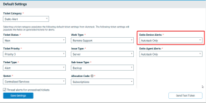 - Autotask: Diese Einstellung erstellt ein Ticket in Autotask über eine Backend-Verbindung mit dem zuvor bei der Authentifizierung eingegebenen Mitarbeiter, sendet jedoch keine E-Mail. Sie müssen eine E-Mail-Adresse für Geräte & Agent-Warnungen & eingegeben haben, um diese Einstellung verwenden zu können.