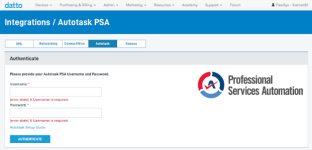 Geben Sie den Benutzernamen und das Passwort eines Autotask-API-Benutzerkontos ein und klicken Sie dann auf Authentifizieren.