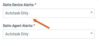 Solange der Abschnitt Datto Gerätewarnungen innerhalb der Autotask-Integration für ein Gerät auf Nur Autotask eingestellt ist, werden keine E-Mail-Warnungen konfiguriert.
