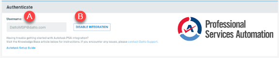 (B) Sie sehen auch eine Schaltfläche zum Aktivieren oder Deaktivieren der Autotask-Integration.