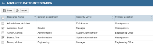 - Auf der Seite Erweiterte Datto BCDR-Integration werden alle aktiven Mitarbeiter aufgelistet. Markieren Sie das Kontrollkästchen neben den Mitarbeitern, für die Sie die Integration aktivieren möchten.