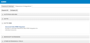 Navigieren Sie zu Linkes Navigationsmenü > Verwaltung > Verwaltungskategorien > Erweiterungen & Integrationen > Datto RMM und klicken Sie auf Erweiterte Datto RMM-Integration.