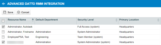 - Auf der Seite Erweiterte Datto RMM-Integration werden alle aktiven Mitarbeiter aufgelistet. Markieren Sie das Kontrollkästchen neben den Mitarbeitern, für die Sie die Integration aktivieren möchten. Um den Zugriff für alle aktiven Mitarbeiter zu aktivieren, klicken Sie in der Überschriftszeile auf das Kontrollkästchen Alle auswählen.