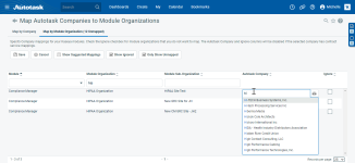 - Wenn der Name der Modulorganisation den Autotask-Firmennamen enthält und es weniger als 20 Übereinstimmungen gibt, wird das Zuordnungsfeld aktiviert, und in der Dropdown-Liste werden die entsprechenden Organisationsnamen angezeigt. Sie wählen eine Option aus, um sie der Firma zuzuordnen.