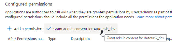 - Die Anwendungsberechtigungen werden hinzugefügt, jedoch werden sie zunächst Nicht gewährt. Klicken Sie auf Admin-Zustimmung für [Name Ihrer lokalen Organisation] erteilen.