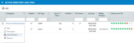Um eine neue Firma zu konfigurieren, klicken Sie auf Hinzufügen. Siehe Einrichten einer Active Directory-Synchronisation für eine Firma in Autotask.