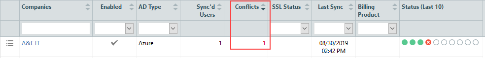 - Sortieren Sie auf der Auflistungsseite anhand der Spalte Konflikte in absteigender Reihenfolge, sodass Kunden mit Zuordnungskonflikten oben stehen.