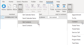 - On the Autotask menu in Outlook, go to Autotask group > More > Get Contacts.