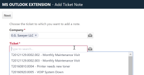 - For ticket, project, and task notes, a dialog box will appear and prompt you to select first the Company, for tasks the Project, and then the Ticket or Task you want to associate the note with.
