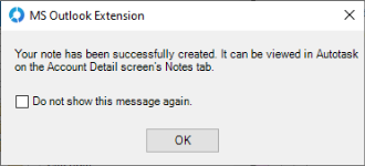 - If the note is successfully created in Autotask and the Display "Success" message when a note is successfully created using the Send to Autotask button is enabled, the following information box will appear: