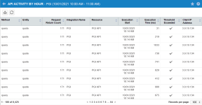 Die Seite API-Aktivität pro Stunde bietet Ihnen stündliche Details in Bezug auf Ihre SOAP- und REST API-Aktivität pro Integration. Der Bericht zeigt Ihnen alle Instanzen, bei denen Abfrageaktivitäten die Grenzwerte für Anfragen überschreiten. Sie können sehen, was Ihre Integrationsanbieter mit der API unternommen haben. Um die Seite zu öffnen, nutzen Sie den/die Pfad(e) im vorstehenden Abschnitt Sicherheit und Navigation.