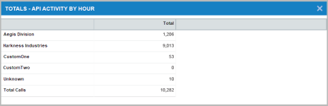 Die Tabelle für Aktivität schlüsselt API-Aufrufe nach ausgewählter Kategorie und Stunde auf. Um auf diesen Bericht zuzugreifen, klicken Sie auf eine beliebige Stunde oder Anzahl von Aufrufen unter einem Lieferantennamen im Abschnitt Registerkarte „Zusammenfassung“.