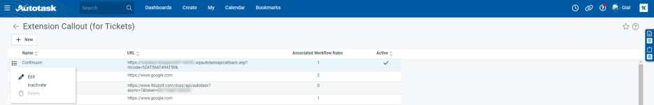 - Die Tabelle zeigt die Namen aller Erweiterungsmodul-Callouts, die URLs, an die die Daten gesendet werden, die Anzahl der zugehörigen Workflow-Regeln und ob der Callout gerade aktiv ist.