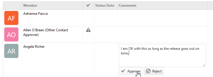 Im Raster wird der Genehmigungsstatus, das Datum für den Status und jegliche von den Genehmigern hinzugefügte Kommentare angezeigt. Wenn Sie ein Genehmiger sind, können Sie Kommentare eingeben und auf „Genehmigen“ oder „Ablehnen“ klicken.