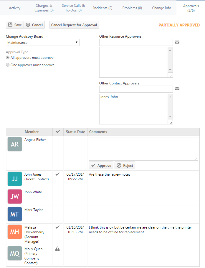 Die Registerkarte Genehmigungen wird nur bei Tickets vom Typ Change Request angezeigt. Auf dieser Registerkarte definieren und erfassen Sie den Genehmigungs-/Ablehnungsvorgang für ein Change Request-Ticket. Sobald der Change angefragt wurde, können Ihre genannten Genehmiger den vorgeschlagenen Change genehmigen oder ablehnen.