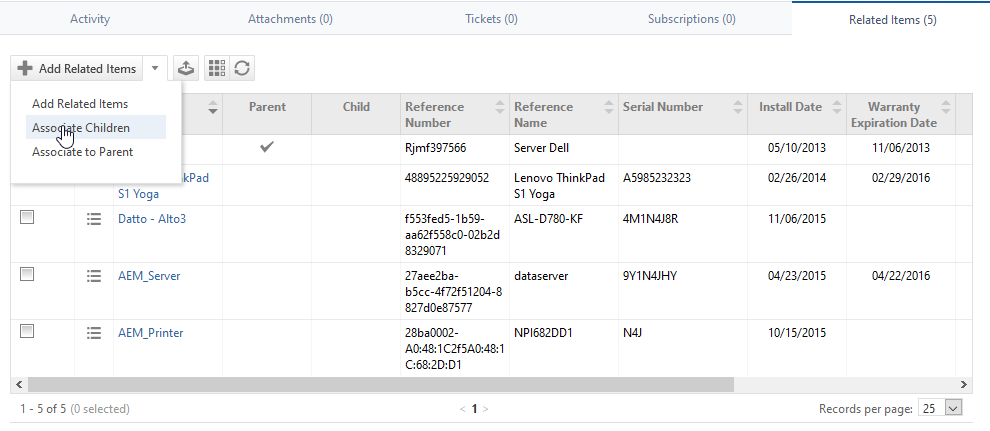 HINWEIS Datum/Uhrzeit der letzten Aktivität und Mitarbeiter/Kontakt für letzte Aktivität bei einem Gerät werden nicht aktualisiert, wenn ein anderes Gerät dem Gerät als untergeordnetes oder übergeordnetes Gerät zugewiesen wird.