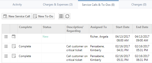 Auf der Registerkarte Servicetermine & To-Dos eines Tickets können Benutzer mit den erforderlichen Zugriffsberechtigungen Servicetermine und To-Dos erstellen und verwalten, die mit dem Ticket verbunden sind.