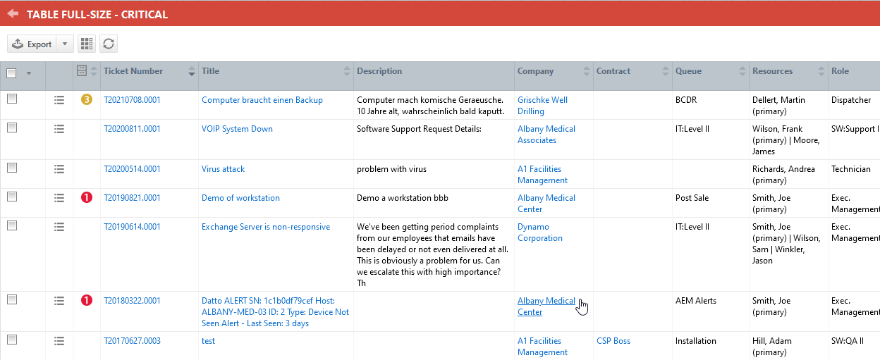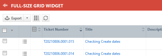 Viele Autotask-Kunden verwenden Raster-Widgets und Diagramm-Widgets vom Typ Tabelle im Wesentlichen als gespeicherte Suchen. Da sie oft eine lange Liste von Elementen enthalten, haben Sie die Möglichkeit, sie als Widgets ganzer Registerkarten zu erstellen, die den gesamten verfügbaren Platz auf der Registerkarte einnehmen. Sie brauchen nicht zu blättern, um bis zu 100 Artikel anzuzeigen.