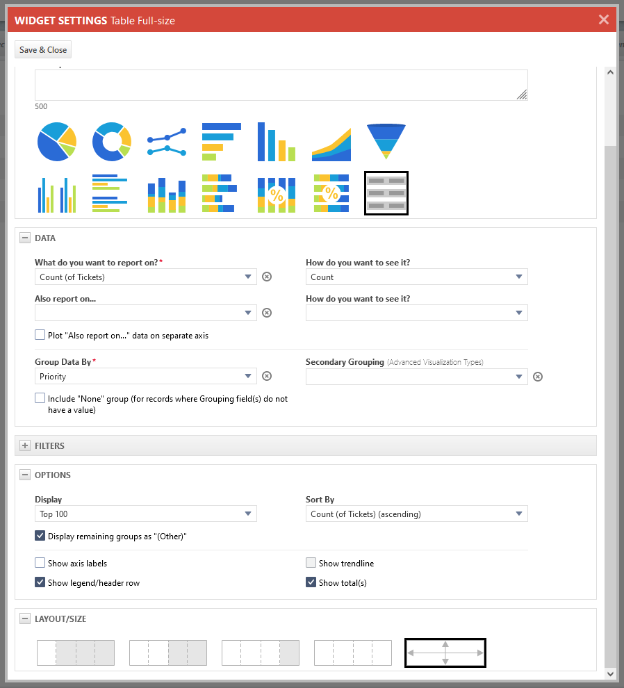 Bei Tabellen-Widgets in voller Größe müssen Sie die Daten nach einem Feld gruppieren, das Sie auswählen müssen. Die erhaltene Widget-Tabelle erscheint wie ein Übersichtsbericht.
