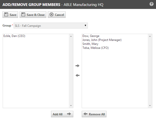 Die Seite Gruppenmitglieder hinzufügen/entfernen wird geöffnet. Alle Kontakte der aktuellen Firma erscheinen auf der linken Seite.