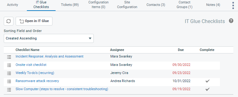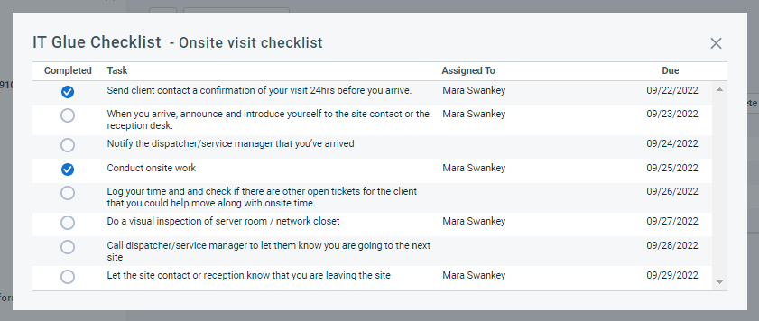- Nach der Einrichtung können Sie IT Glue-Checklisten in Autotask oder IT Glue öffnen und Checklisten und einzelne Aufgaben abschließen.